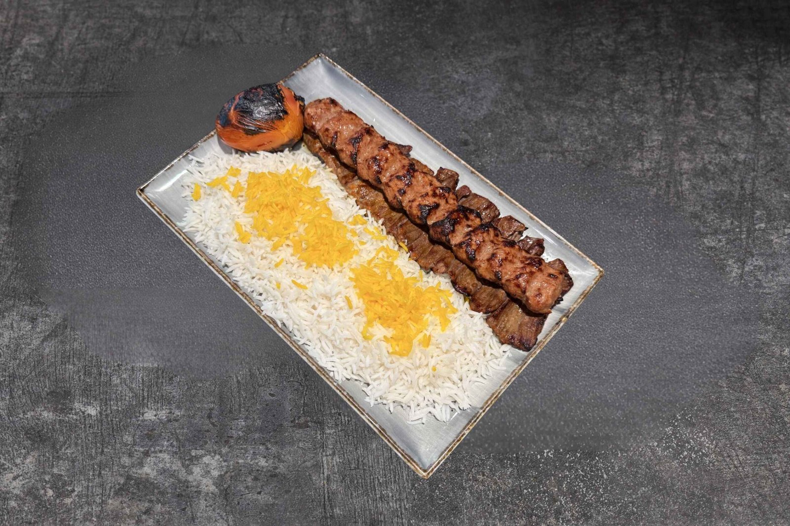 Combination of skewered tenderloin beef and a skewer of ground beef. Cooked over an open fire and served with BBQ tomato and basmati rice.