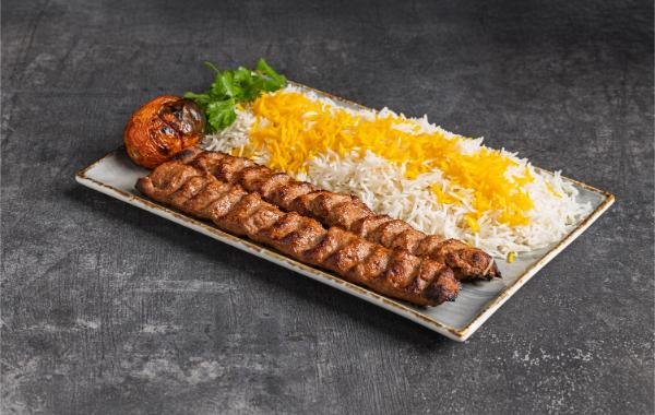 Two skewers of ground sirloin seasoned and mixed with grated onions and broiled on an open flame. Served with steamed basmati rice and BBQ tomato.