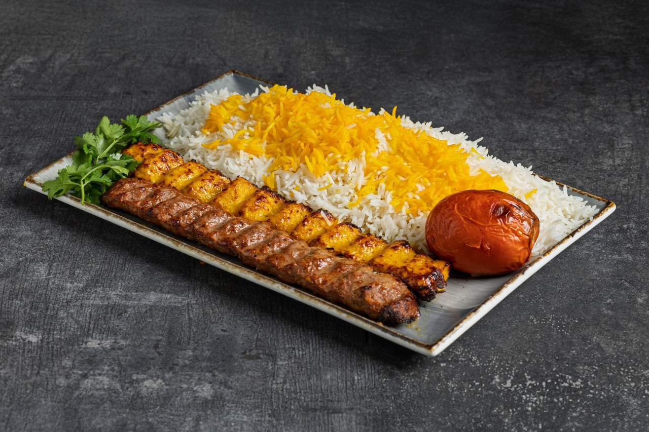 One skewer of ground sirloin (beef koobideh) ans one skewer of ground chicken seasoned and mixed with grated onions (chicken koobideh), grilled on an open flame. Served with steamed basmati rice and BBQ tomato.